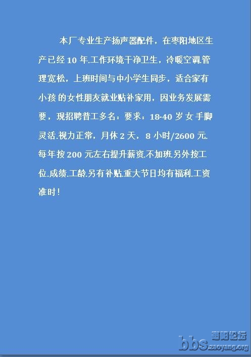 本厂作业生产扬声器配件.现招聘女工18-40岁.白班8小时.固定工资.2400-3000元(月休两天)不加班. 自愿加班的按15元1小时计算.建设路(沙店附近)工资准时